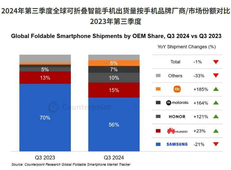 目前看来,联想在摩托罗拉上搭载的AI能力,已经达到主流手机的AI助手级别。随着AI落地,摩托罗拉的销量已经明显改善。据Counterpoint Research发布的2024年第三季度全球折叠屏手机市场数据显示,摩托罗拉出货量以高达164%的增速,占据7%的市场份额,位列全球第四。