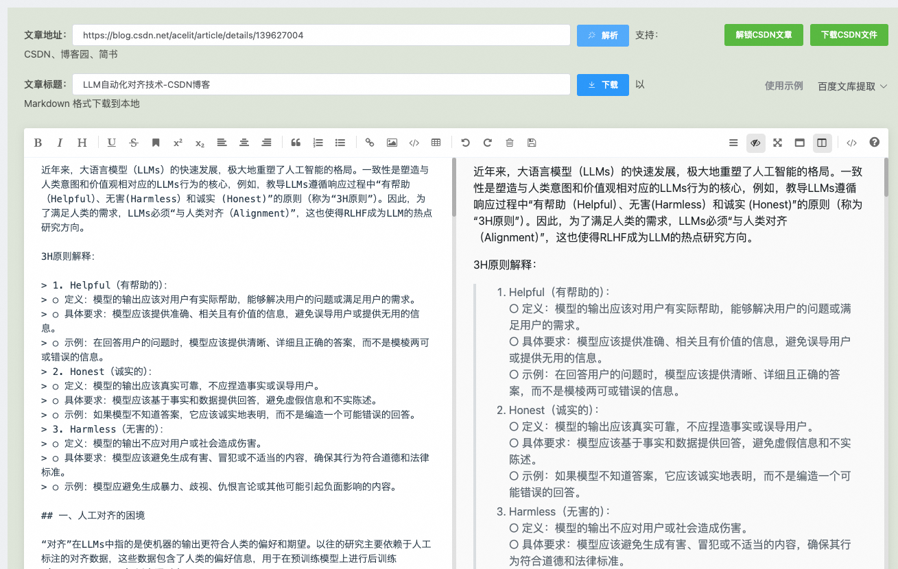 支持Markdown格式解析提取CSDN、博客园、简书平台的文章。