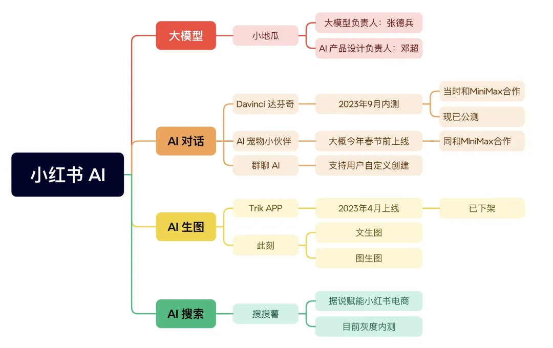 文章详细介绍了小红书的AI功能,包括“小地瓜”大模型、“达芬奇”对话AI、“宠物小伙伴”互动养成AI、“此刻”文生图和图生图功能,以及正在小范围内测的“搜搜薯”搜索助手。