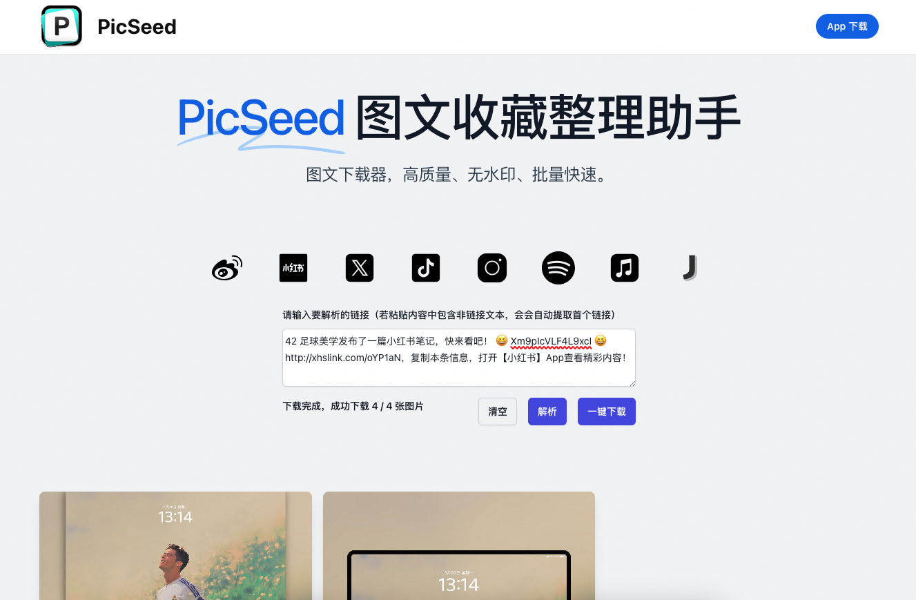一款图片收藏助手,支持从微博、小红书、推特、Instagram、Spotify、AppleMusic和即刻等多个平台高质量、无水印、批量快速下载图片。