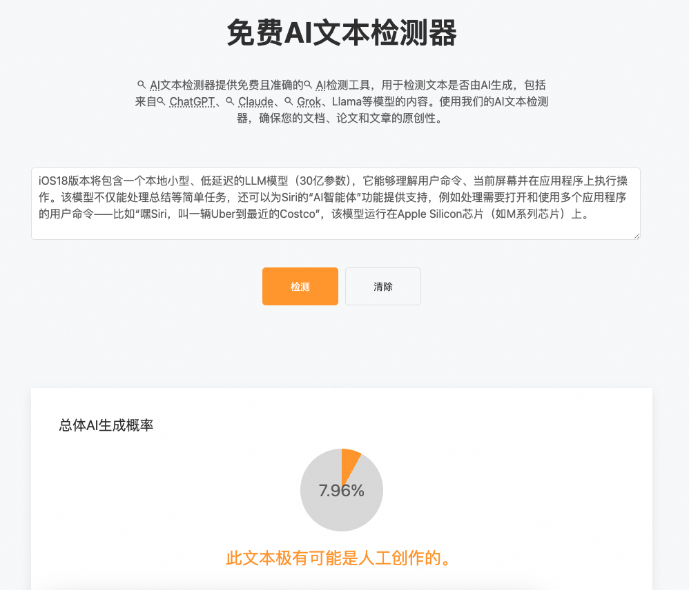 一款免费的AI文本检测工具,用于检测文本是否由AI生成,包括来自ChatGPT、Claude、Grok、Llama等模型的内容。