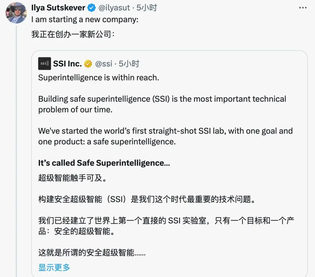 本周四(6月20日)凌晨,OpenAI前首席科学家Ilya Sutskever宣布创立了一家名为「安全超级智能」(Safe Super Intelligence,简称SSI)的新公司。SSI公司的唯一重点,是开发安全、强大的通用人工智能(AGI)系统,Ilya认为「这是我们这个时代最重要的技术问题」,而且公司短期内无意销售各种AI产品或服务。
