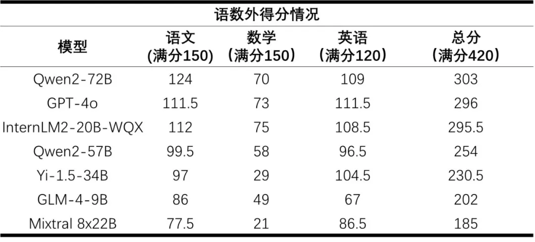 本周,上海人工智能实验室和司南评测体系发布了AI模型参加高考「语数外」全卷能力测试的结果。该测试选取了6个开源模型以及GPT-4o进行,采用了全国新课标I卷,参与评测的所有开源模型,开源时间均早于高考,成绩由具有高考评卷经验的教师人工评判。评测结果显示,Qwen2-72B、GPT-4o及书生·浦语2.0文曲星(InternLM2-20B-WQX)三个模型成为前三甲,得分率均超过70%。大部分模型都在语文、英语两个科目上表现良好,但是数学科目全员不及格,InternLM2-20B-WQX得分75(满分150)最高,超过GPT-4o的73分。