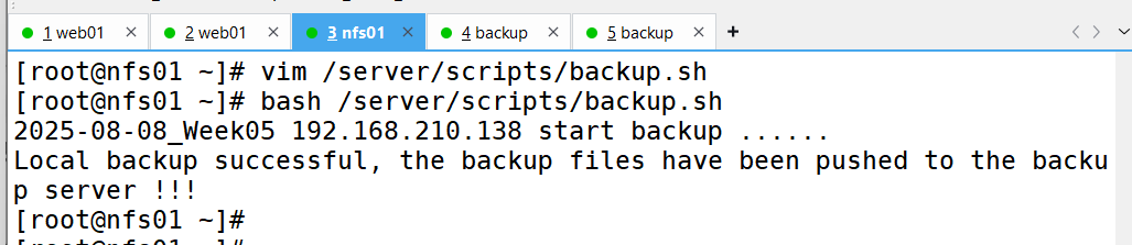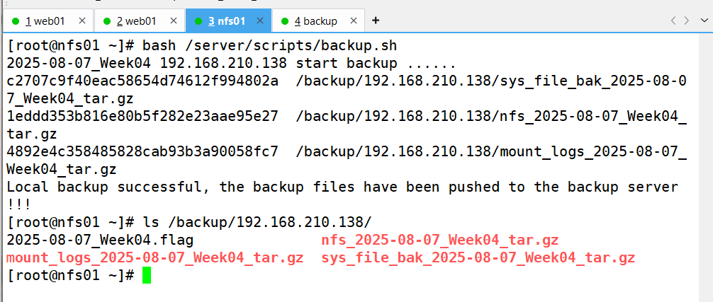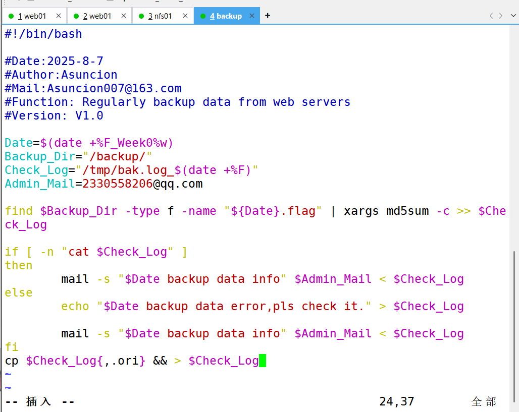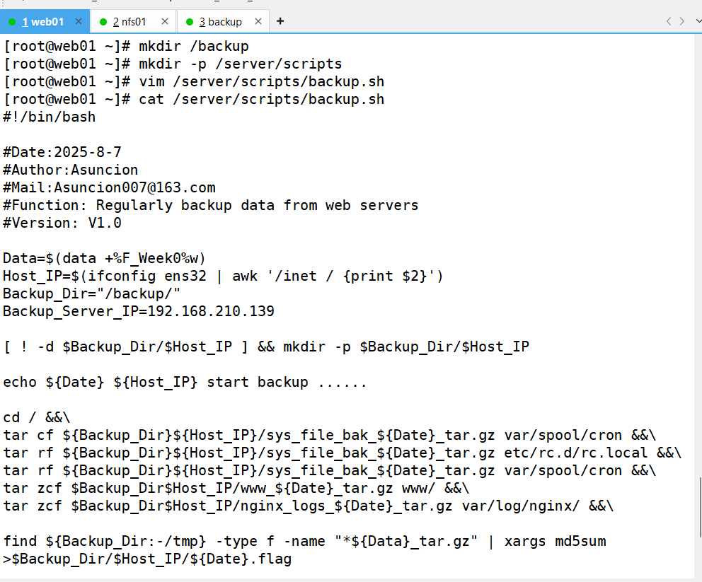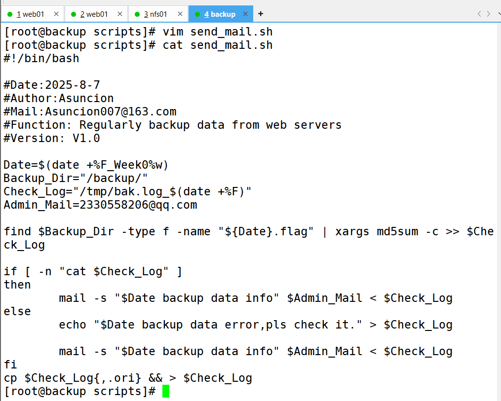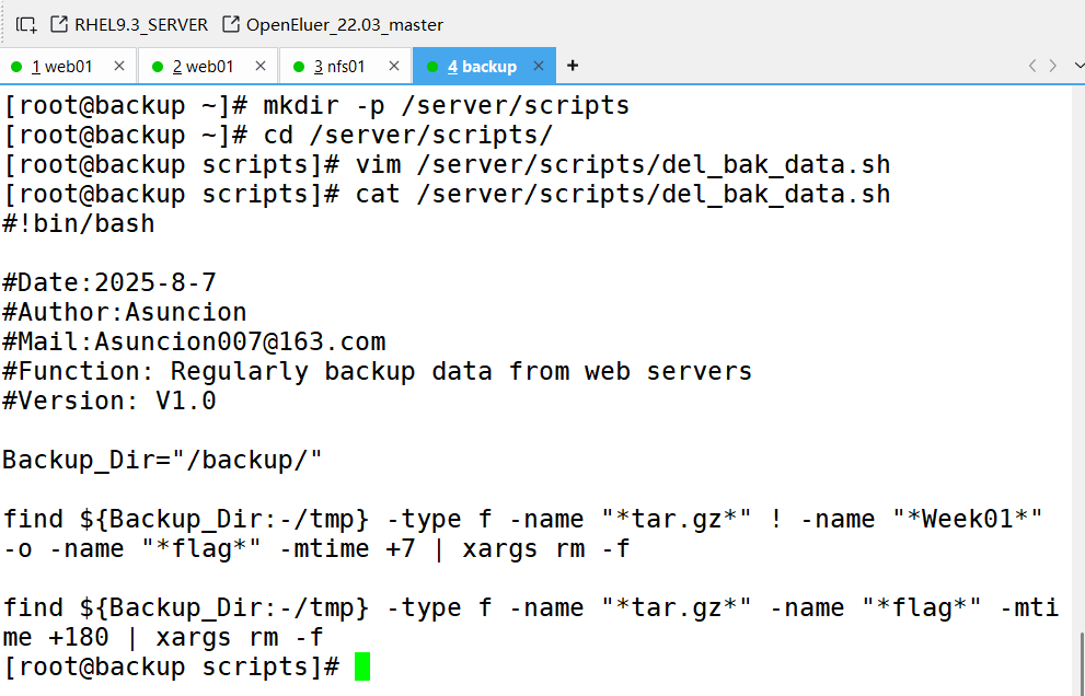 要求:备份服务器(backup)开发脚本,实现删除旧备份数据(保留最近 7 天所有数据及 6 个月内每周一的数据副本)、校验备份数据完整性及配置告警邮件发送等功能。配置定时任务,使 Web 服务器和 NFS 服务器每天 0 点定时推送备份数据,备份服务器每天执行数据清理等任务