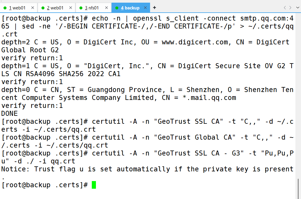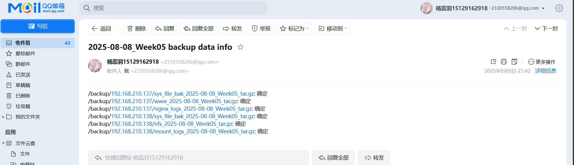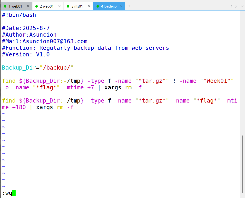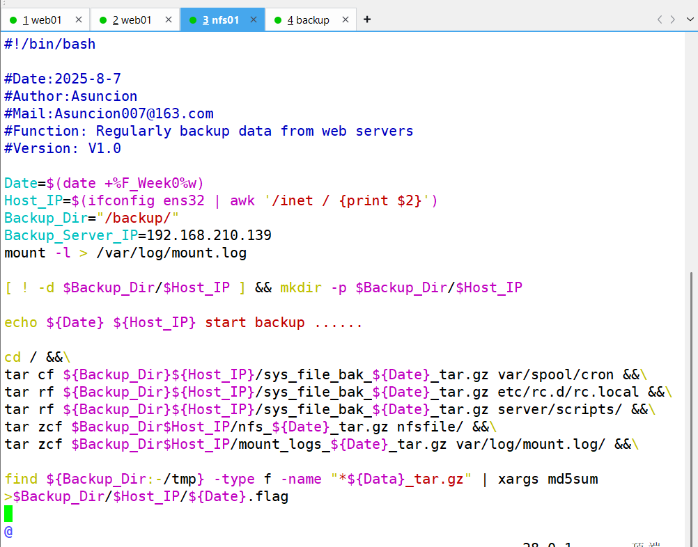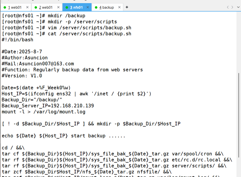 要求:备份服务器(backup)开发脚本,实现删除旧备份数据(保留最近 7 天所有数据及 6 个月内每周一的数据副本)、校验备份数据完整性及配置告警邮件发送等功能。配置定时任务,使 Web 服务器和 NFS 服务器每天 0 点定时推送备份数据,备份服务器每天执行数据清理等任务