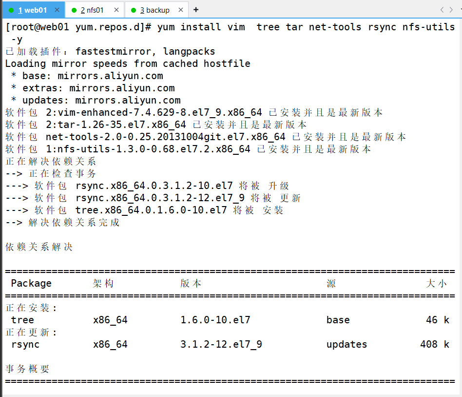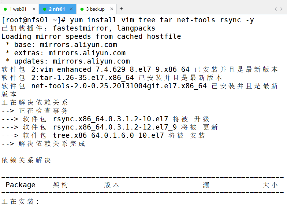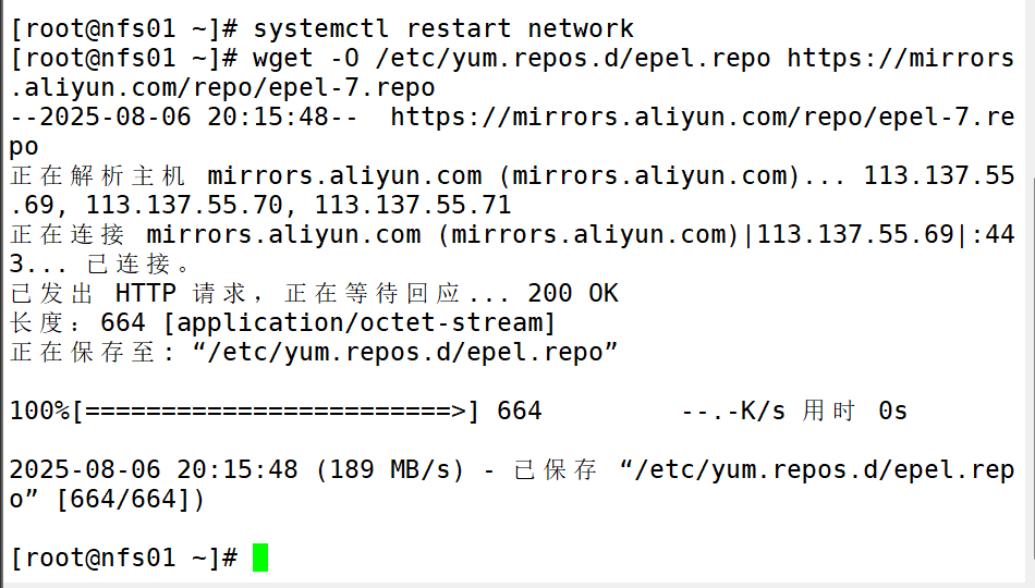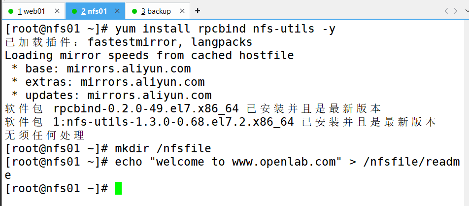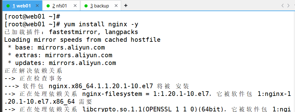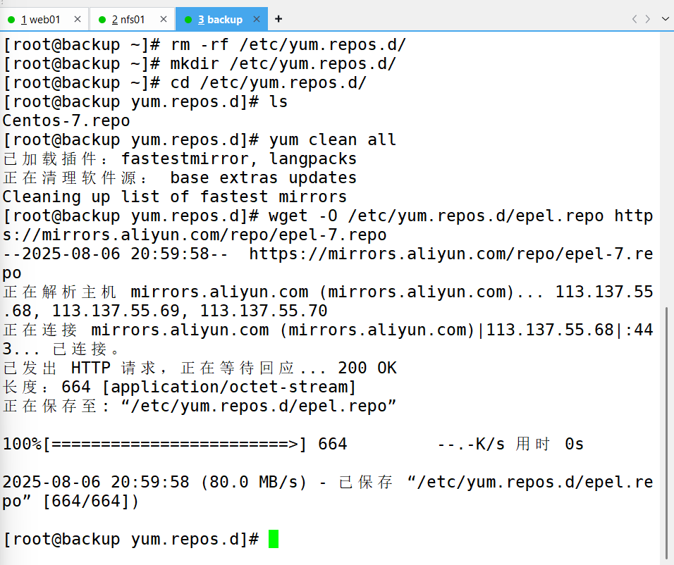 3、更换为阿里镜像、下载需要用的环境(跳到nfs01机子进行服务器搭建然后将网页挂在web01上)[根据以下步骤]