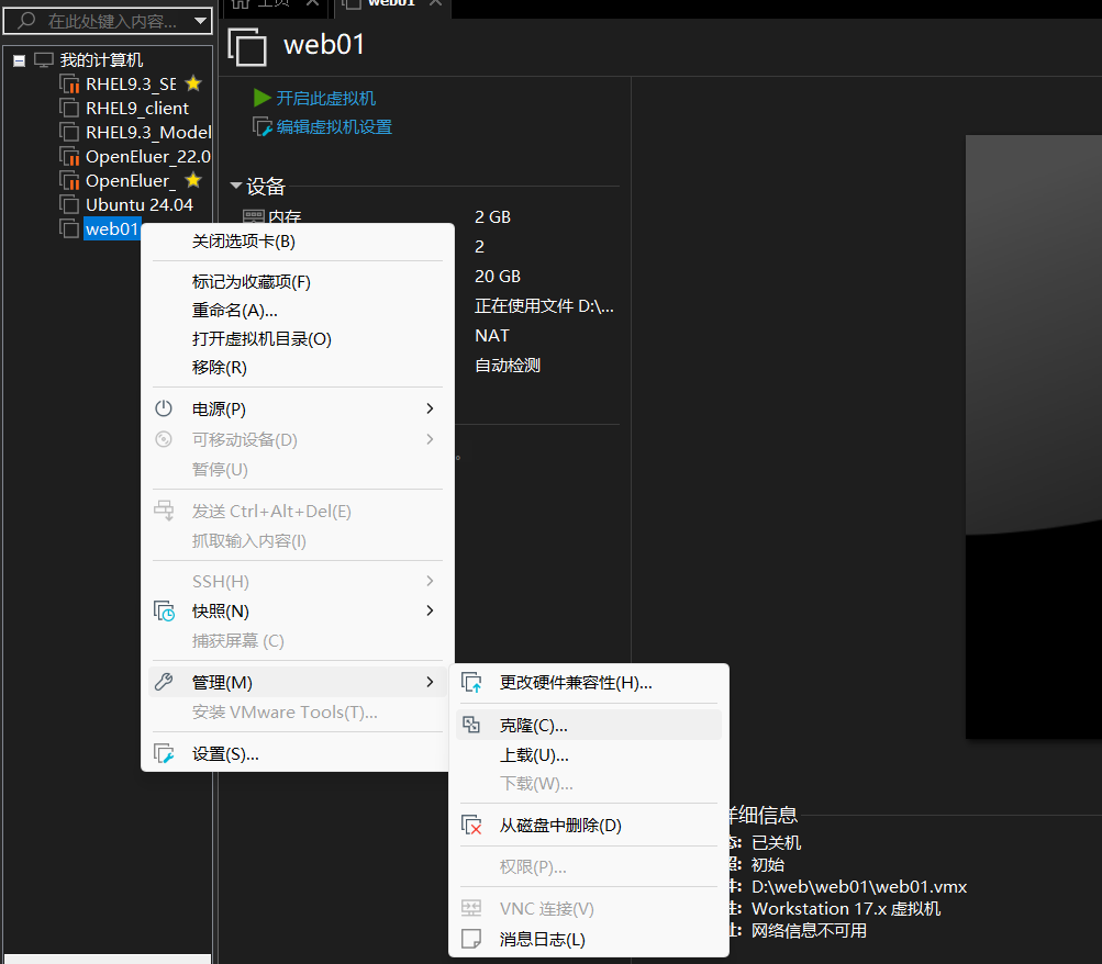 2、根据以下步骤进行创建,创建好之后再克隆两台机子即可。(右击要克隆的主机,即可进行克隆)克隆要关机呦!