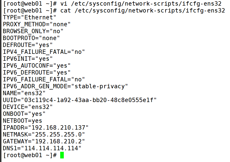 2、编写网络配置文件,写静态IP,重启网络使其生效。