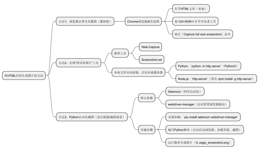 库,编写脚本自动启动浏览器、加载 HTML 页面并截图;需先安装依赖,运行脚本即可生成图片。