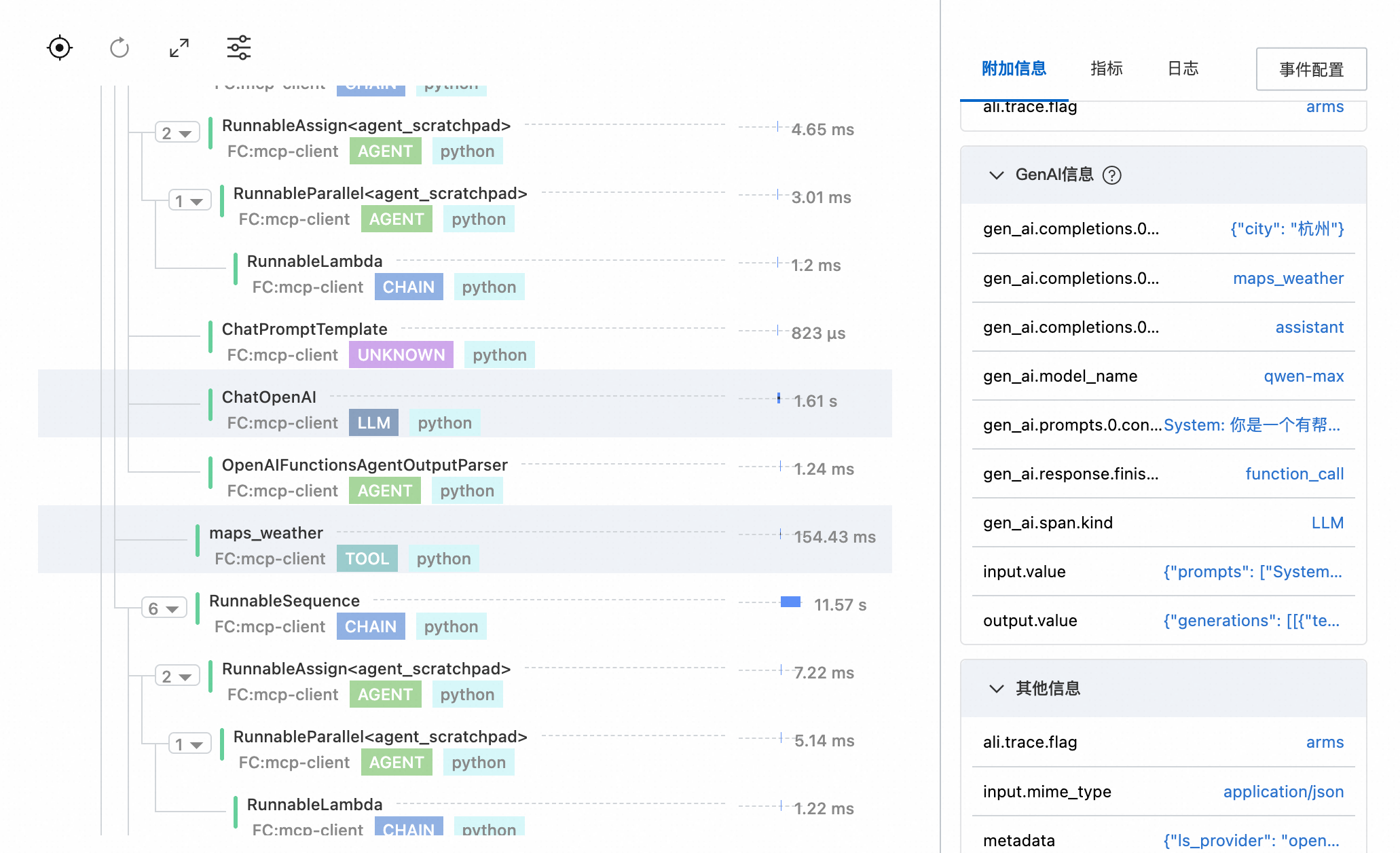 函数计算集成链路追踪后,可以快速定位 Serverless 场景下的性能瓶颈。以一个 langchain 作为 mcp-client 端,高德天气查询作为 mcp-server 端为例。一次查询天气的调用链路如下:可以清晰的看到冷启动信息、sse 连接,message 连接,以及 Agent 的调用信息。