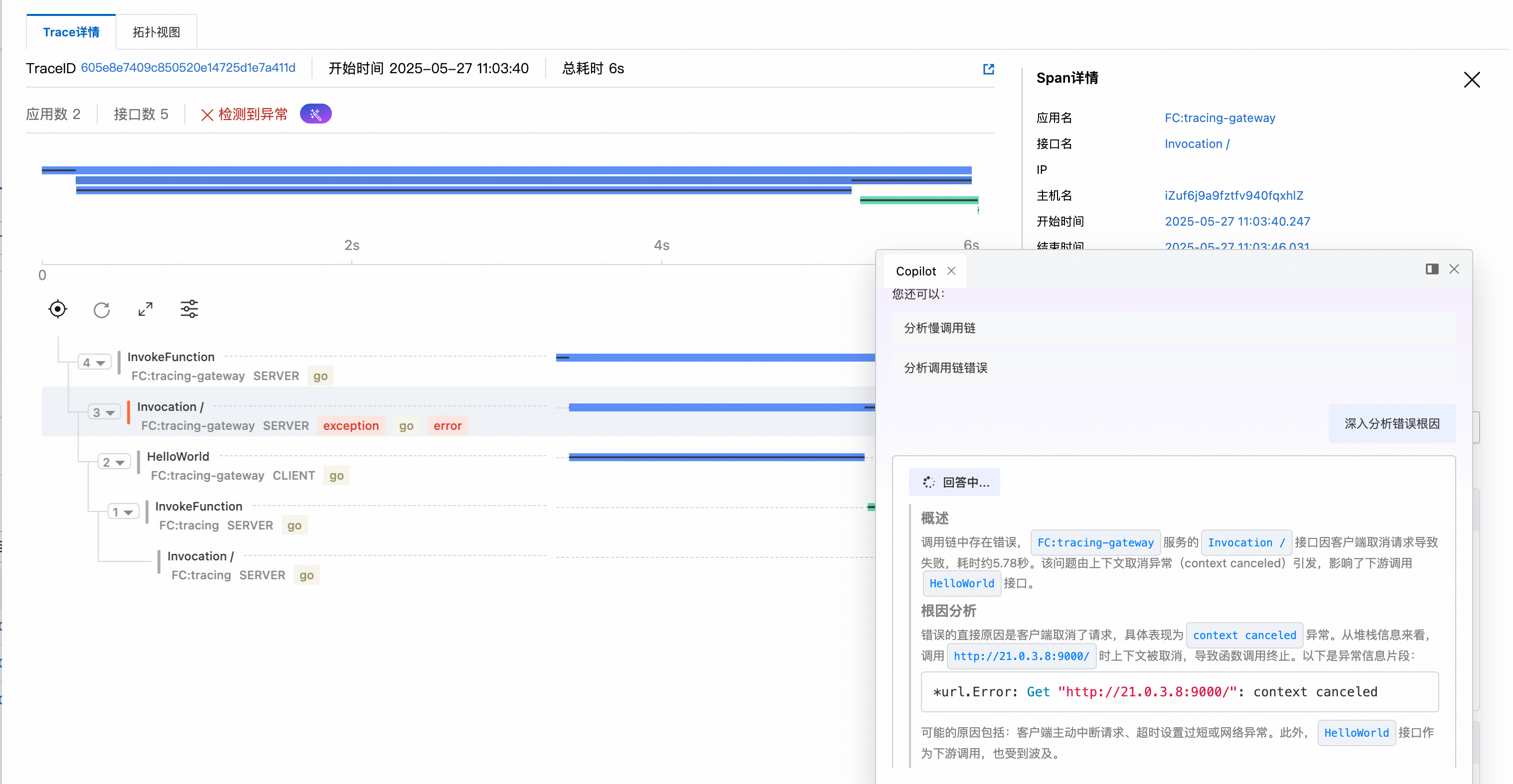 当有异常请求时,定位到对应 trace 可查看异常信息,并利用 AI 运维助手分析 Trace。