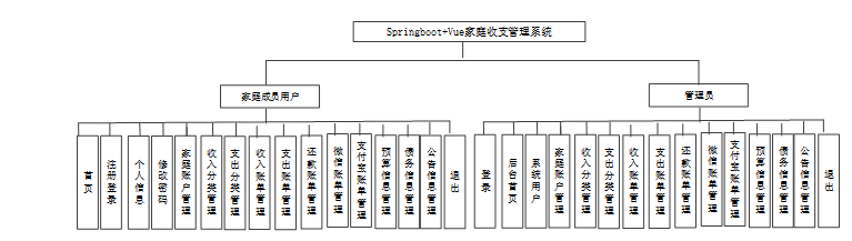 Springboot+Vue家庭收支管理系统的网站功能模块主要涉及有家庭成员用户和管理员二个角色。每个角色对应的功能模块如图4.1所示。