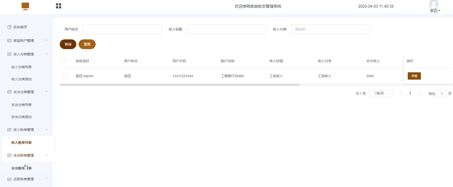 - 收入账单管理:主要展示该用户的收入账单详情。可进行查询、重置、删除等操作。