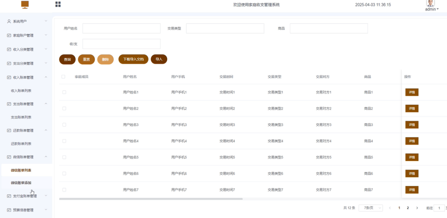 - 微信账单管理:包含微信账单列表和微信账单添加功能。微信账单列表:主要管理所有用户微信账单信息,可进行查询、重置、下载导入、导出、删除等操作。微信账单添加:可手动添加导入的微信账单数据。