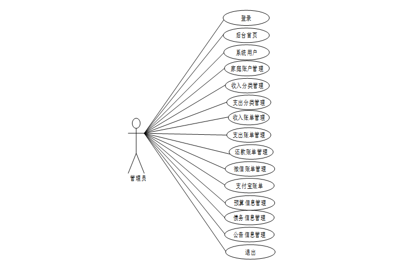 Springboot+Vue家庭收支管理系统的设计与实现中管理员涉及登录、后台首页、系统用户、家庭账户管理、收入分类管理、支出分类管理、收入账单管理、支出账单管理、还款账单管理、微信账单管理、支付宝账单管理、预算信息管理、债务信息管理、公告信息管理等,管理员对应的用例图如图3.2所示: