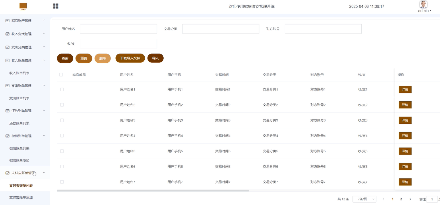 - 支付宝账单管理:包含支付宝账单列表和支付宝账单添加功能。支付宝账单列表:主要展示该用户的支付宝账单信息,可进行查询、重置、下载导入、导出、删除等操作。支付宝账单添加:可手动添加导入该用户的支付宝账单数据。