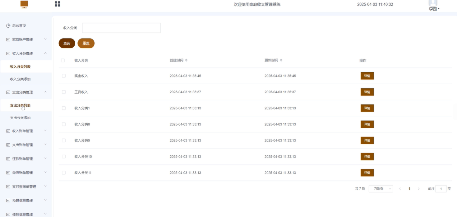 - 收入分类管理:包含收入分类列表和收入分类添加功能。收入分类列表:主要展示该用户的收入分类信息,可进行增删改查等操作。收入分类添加:可手动添加该用户的收入分类数据。
