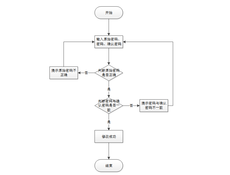 - 修改密码:用户点击“修改密码”按钮,可以对登录密码进行更改,首先输入原密码,然后再输入新密码和确认密码,当原密码正确,输入两次新密码一致,则修改成功,否则给出错误提示信息。