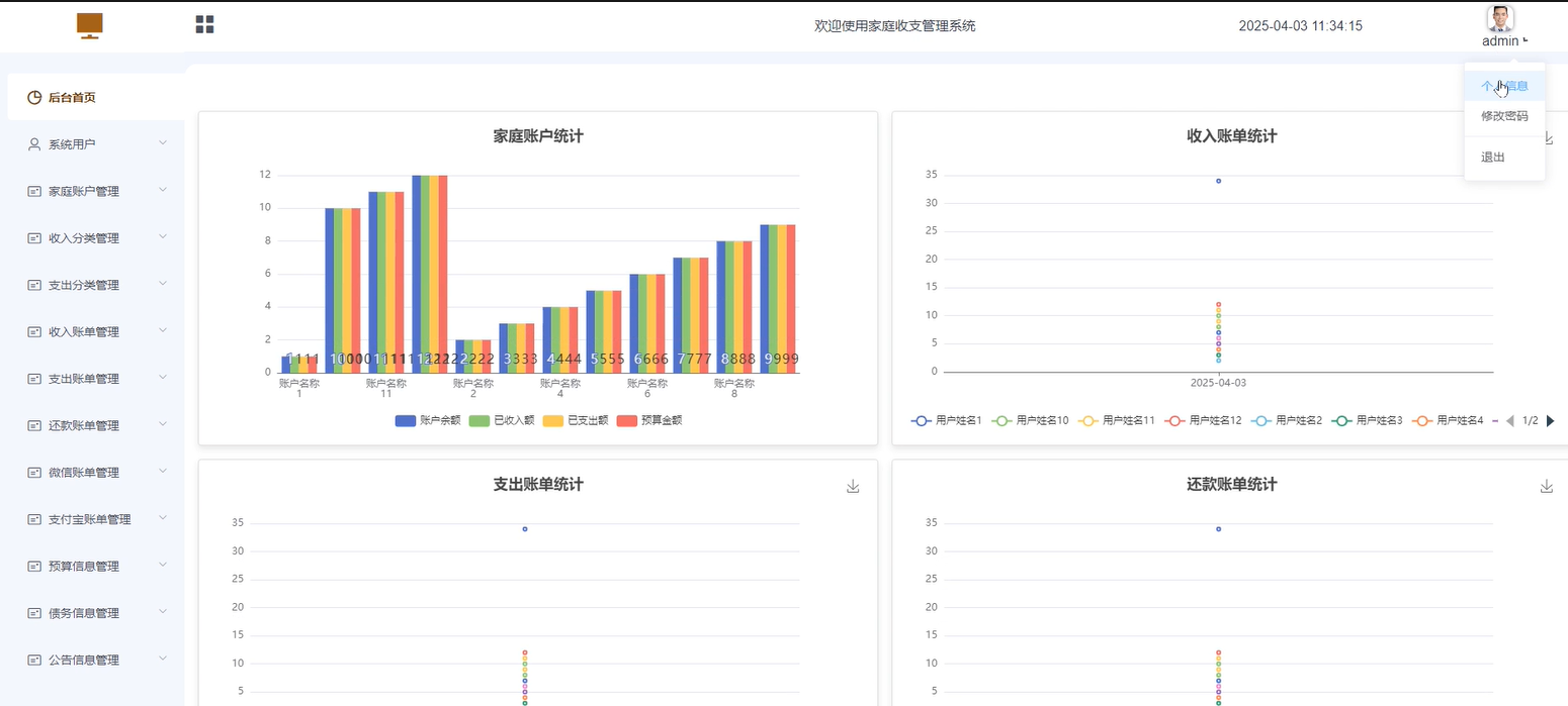 - 后台首页:展示的是家庭账户统计、收入账单统计、支出账单统计、还款账单统计等。