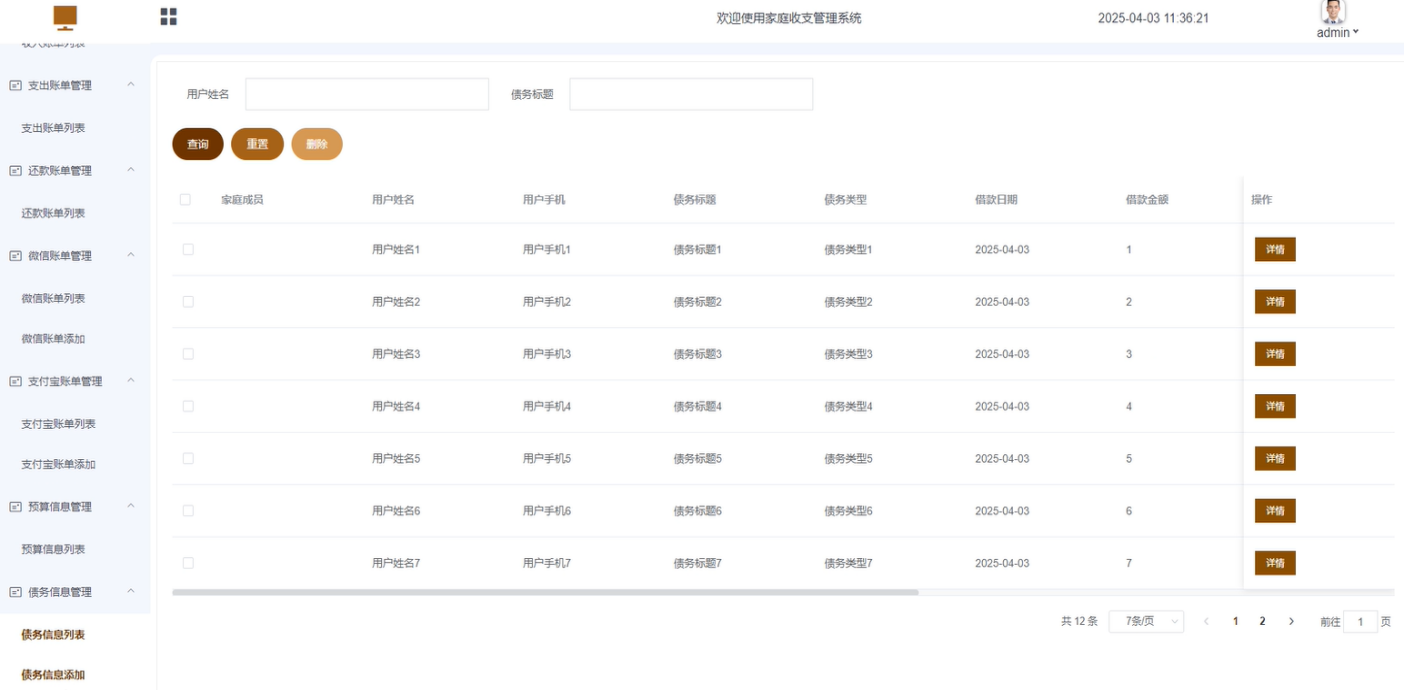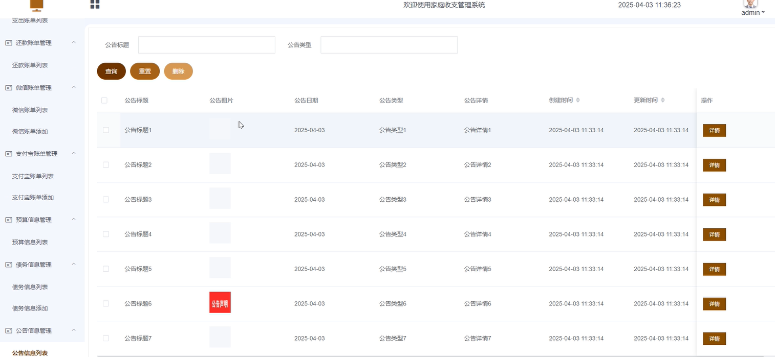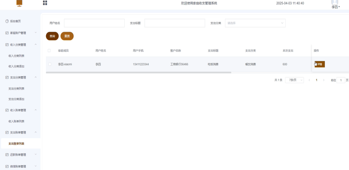 - 支出账单管理:主要管理所有用户的支出账单详情。可进行查询、重置、删除等操作。