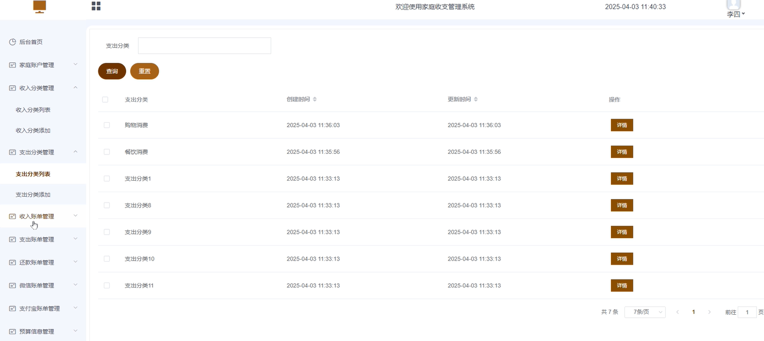 - 支出分类管理:包含支出分类列表和支出分类添加功能。支出分类列表:主要展示该用户的支出分类信息,可进行增删改查等操作。支出分类添加:可手动添加该用户的支出分类数据。