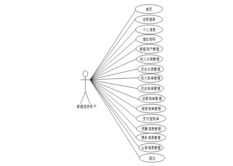 Springboot+Vue家庭收支管理系统中普通用户包含注册登录、首页、个人信息、修改密码、家庭账户管理、收入分类管理、支出分类管理、收入账单管理、支出账单管理、还款账单管理、微信账单管理、支付宝账单管理、预算信息管理、债务信息管理、公告信息管理等功能模块,对应角色用例图如图3.1所示: