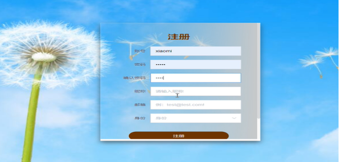 - 注册:在用户注册页面中填写好账号、密码、确认密码、昵称、邮箱、选择身份等信息,点击下方注册按钮,提示注册成功后,系统将自动跳转回到首页。