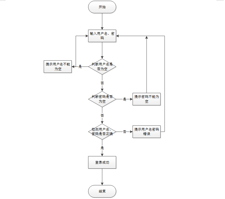 所有用户登录系统需要前端校验用户名、密码是否正确以及是否为空,具体流程图如图所示: