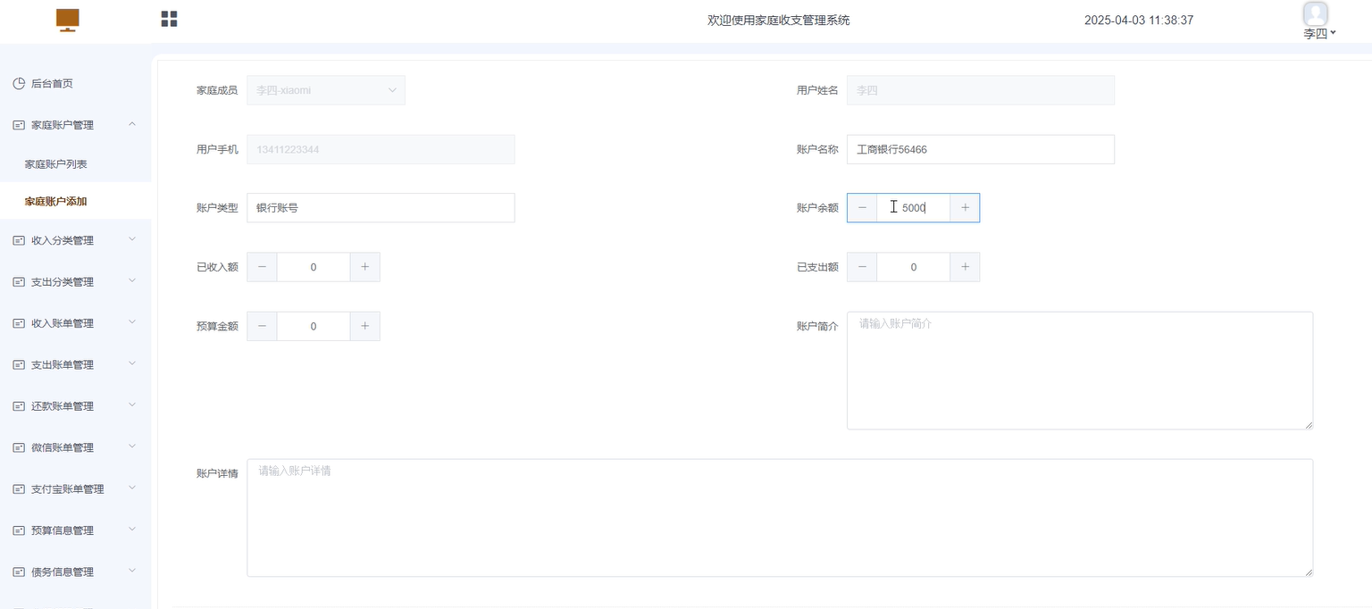 家庭账户添加页输入:账户名称、账户类型、账户简介、账户详情字段信息,点击提交 |