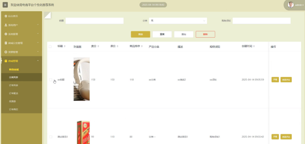 - 商城管理:在商城管理模块中,管理员可以对购物商城的商品进行添加、删除和查询操作,查看商品详情和用户评论。此外,管理员还可以管理商品分类列表,处理订单列表和订单配送状态,以及添加、删除和查询优惠券信息,审核订单和售后服务。
