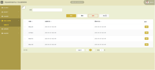 This personalized recommendation system not only covers the registration and login of ordinary users, browsing mall announcements, liking, collecting, and commenting on news, as well as shopping operations such as immediate purchase and adding to cart, but also provides powerful backend management functions for administrators. These include product sales statistics, user and resource management, carousel and announcement management, order review, and after-sales service. By collecting user click preferences, the system can dynamically adjust the content displayed on the homepage, recommending more similar products or information to users, further enhancing the personalized experience. At the same time, leveraging the advantages of Spring Boot simplifies the development configuration process, improving the maintainability and scalability of the system.