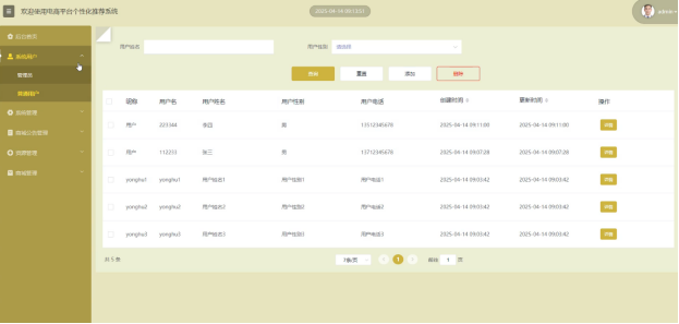 - 系统用户:此模块允许管理员对平台用户进行管理,包括添加、删除和查询用户信息,以及查看用户的详细信息。