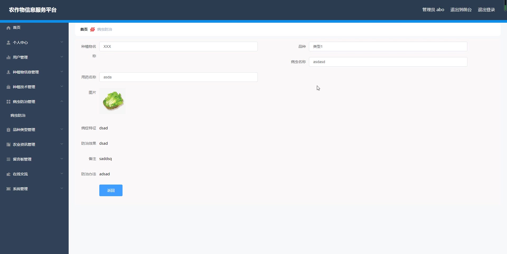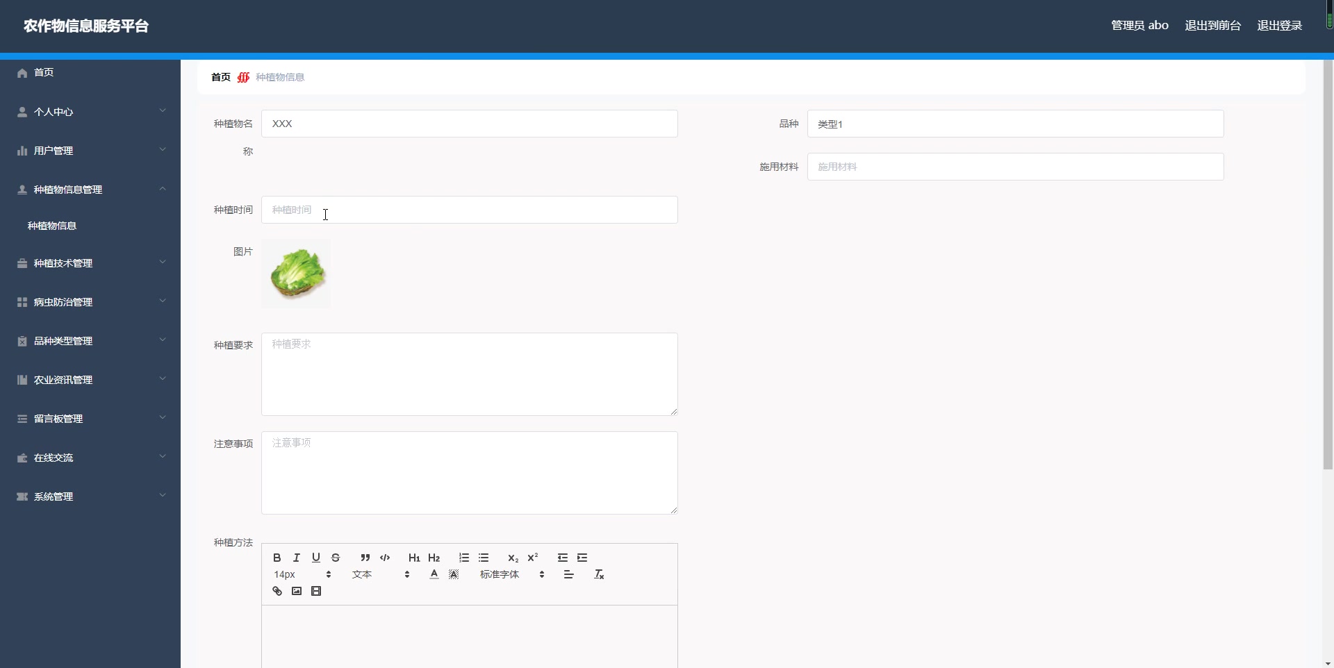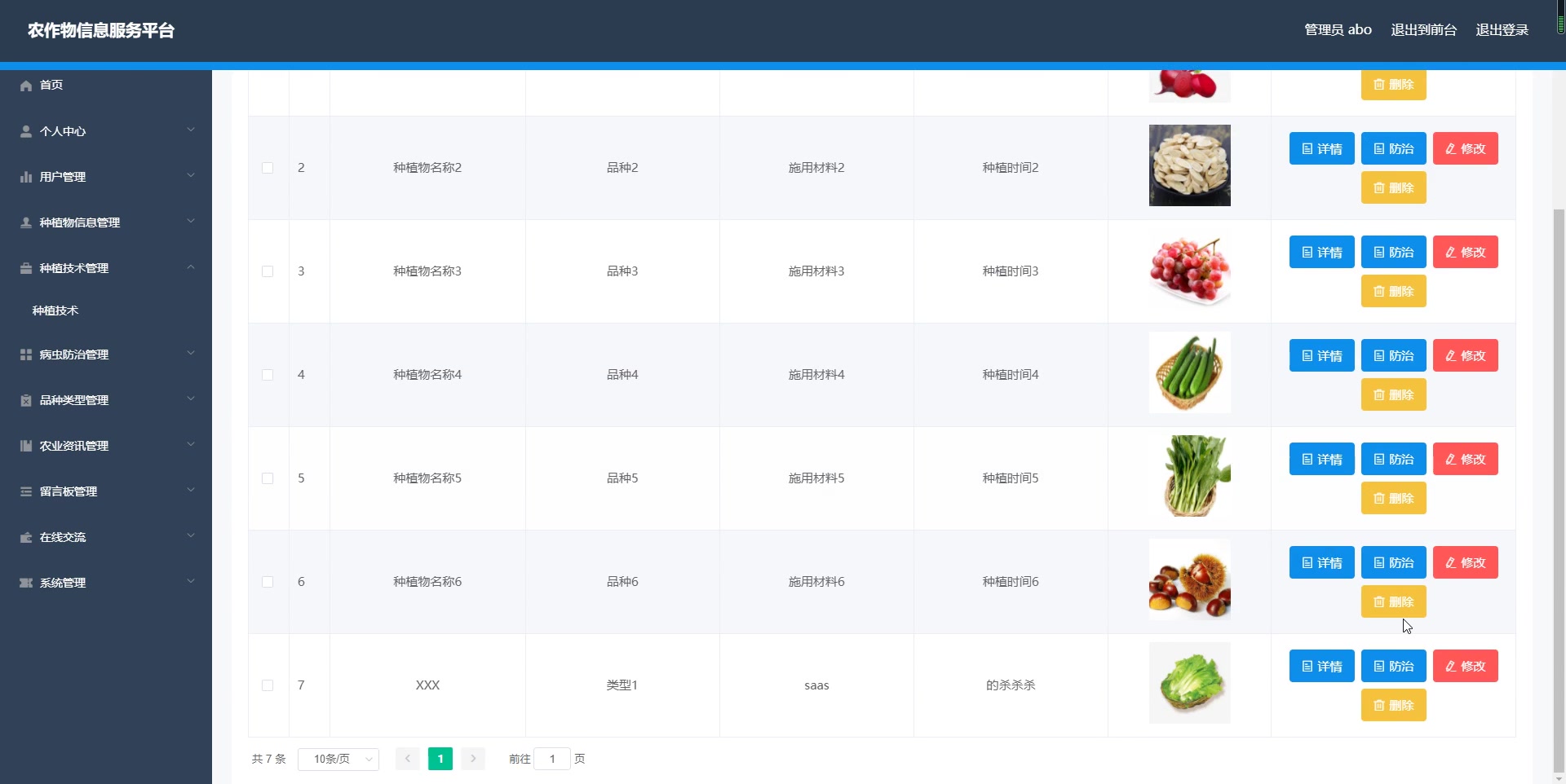 - 个人中心,用户管理,种植物信息管理,种植技术管理,病虫防治管理,品种类型管理,农业资讯管理,留言板管理,在线交流,系统管理等。