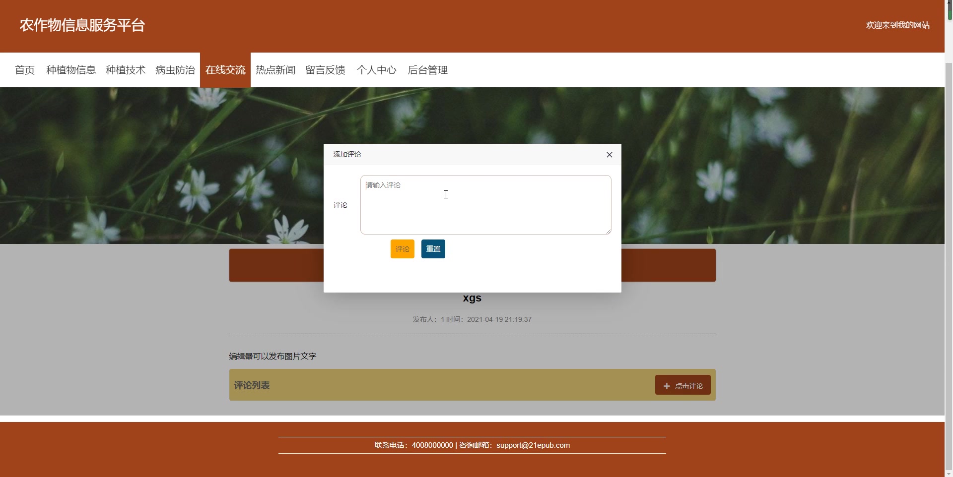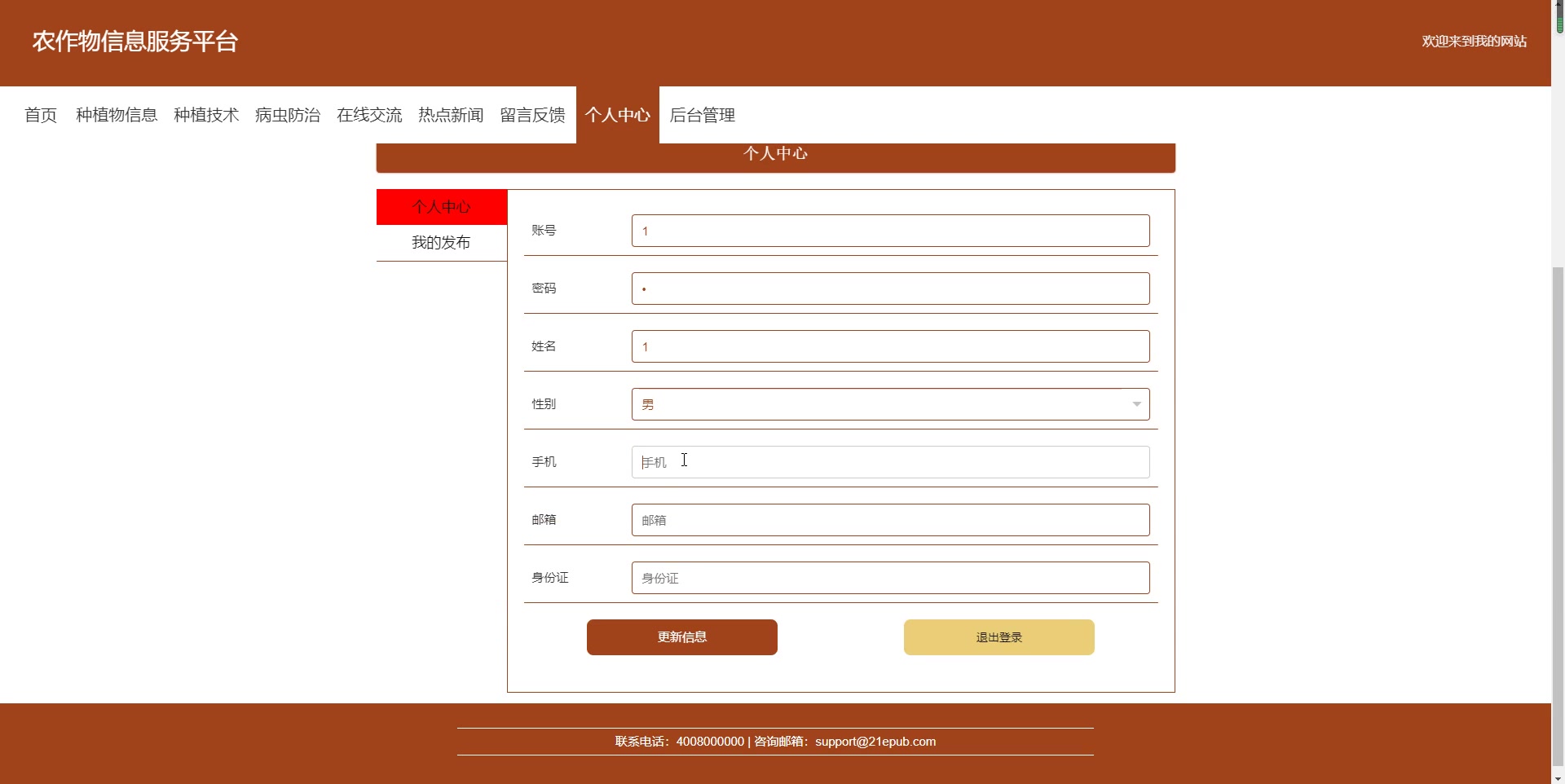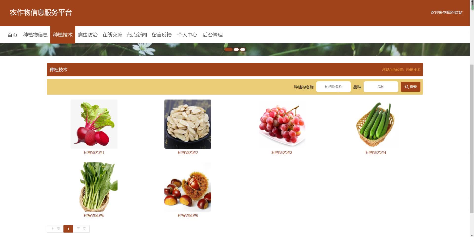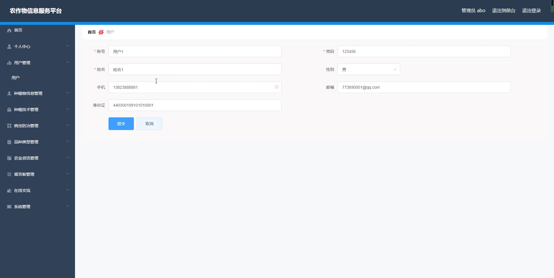 - 个人中心,用户管理,种植物信息管理,种植技术管理,病虫防治管理,品种类型管理,农业资讯管理,留言板管理,在线交流,系统管理等。