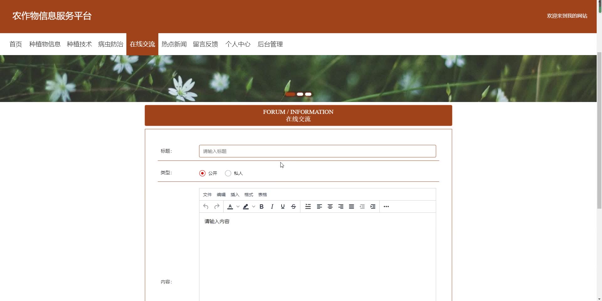 - 在首页查看种植物信息,种植技术,病虫防治,在线交流,热点新闻,留言反馈,个人中心等。
