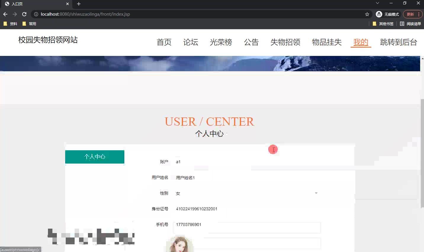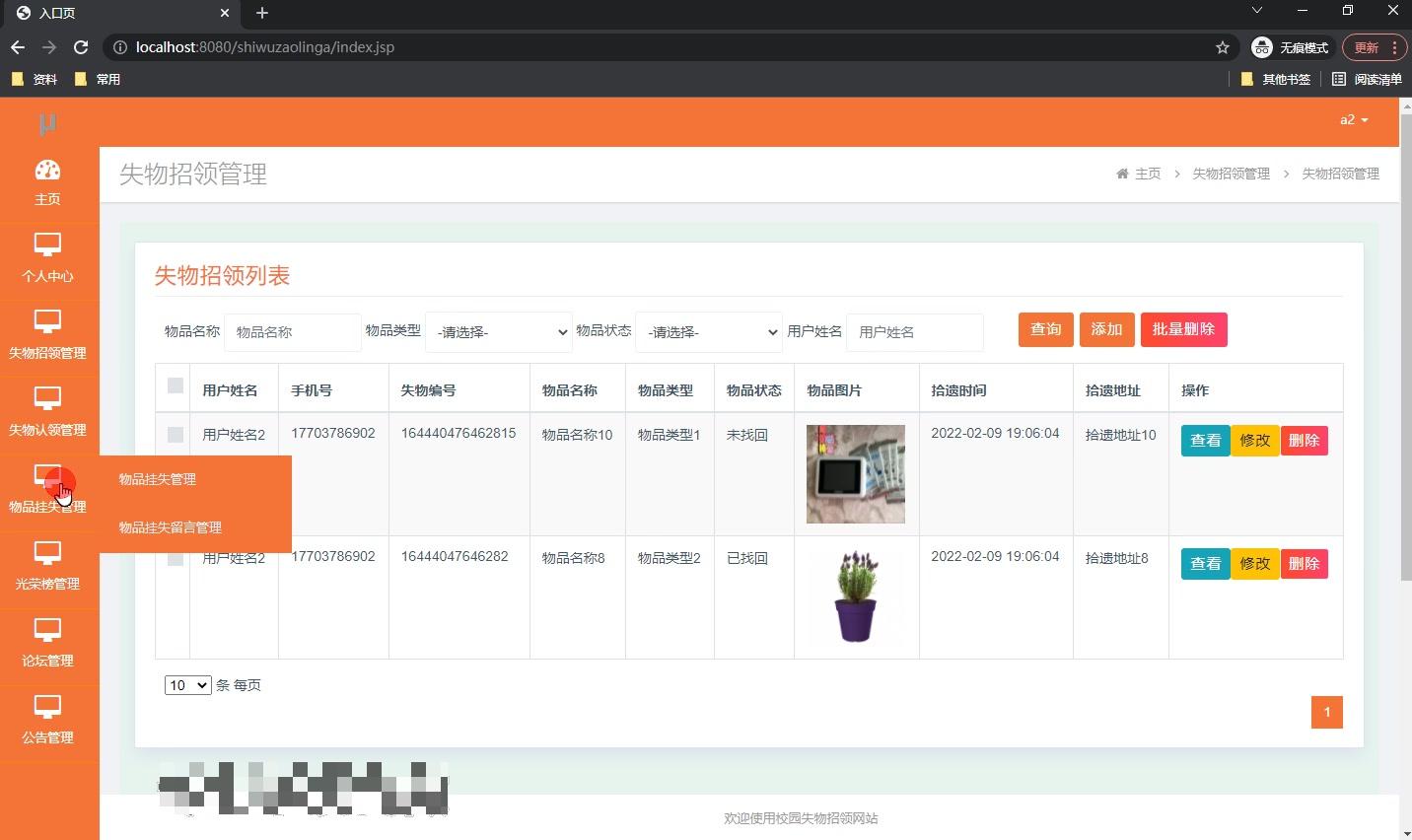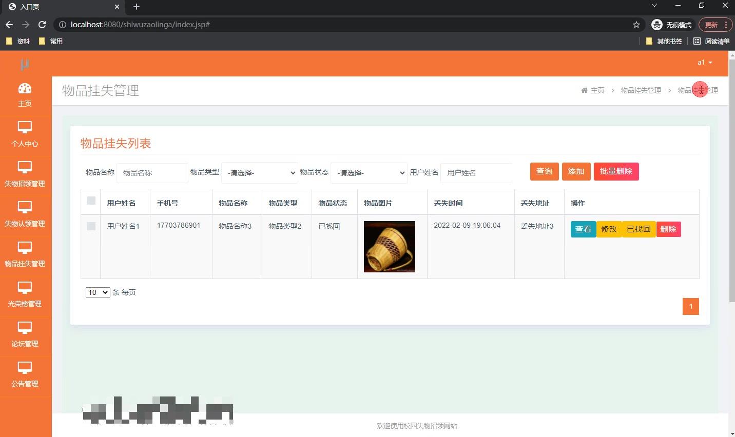 - **其他方面**:可进行物品挂失的添加、修改、删除操作,光荣榜的添加、删改、删除操作,以及失物认领的添加、修改、删除操作等。