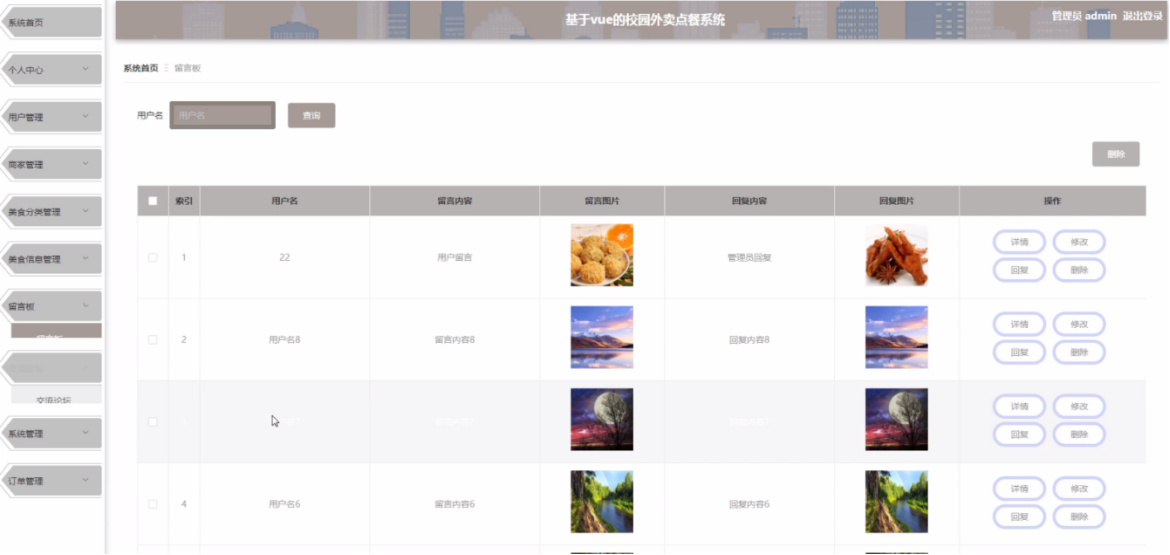 管理员点击留言板,在留言板页面的输入用户名、留言内容、留言图片、回复内容、回复图片等信息,进行查询或者删除留言板等操作,如图5-12所示。