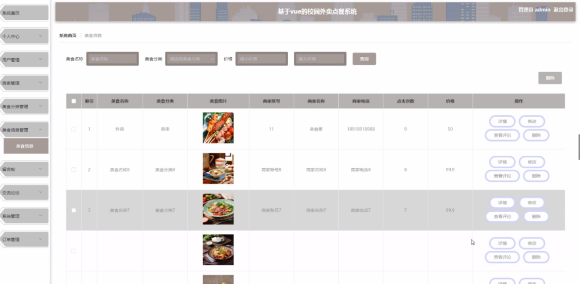 管理员模块:用户管理(添加、删除、修改用户信息)、商家管理(审核商家信息、删除商家)、美食分类管理、美食信息管理、留言板管理、订单管理、系统配置等。