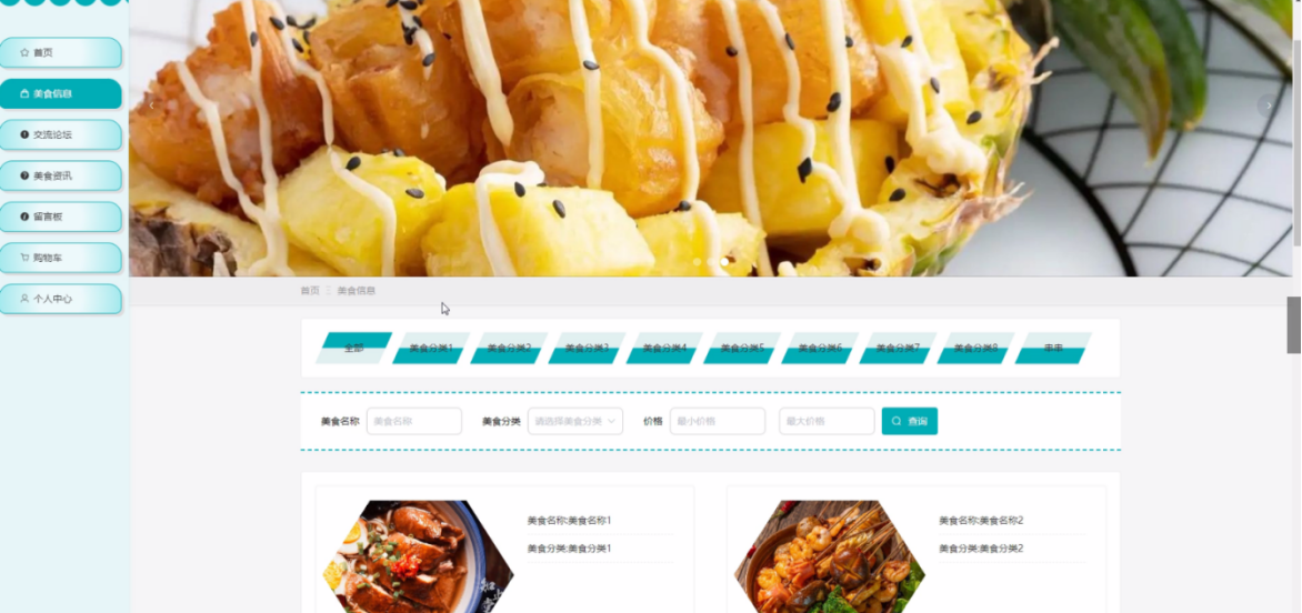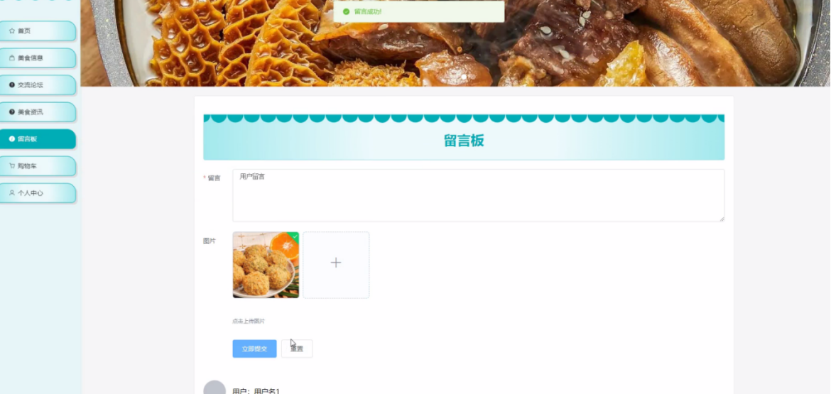 用户模块:用户注册与登录、个人信息修改、美食信息浏览、添加到购物车、立即购买、收藏美食、查看订单历史、发表评论、留言板互动等。