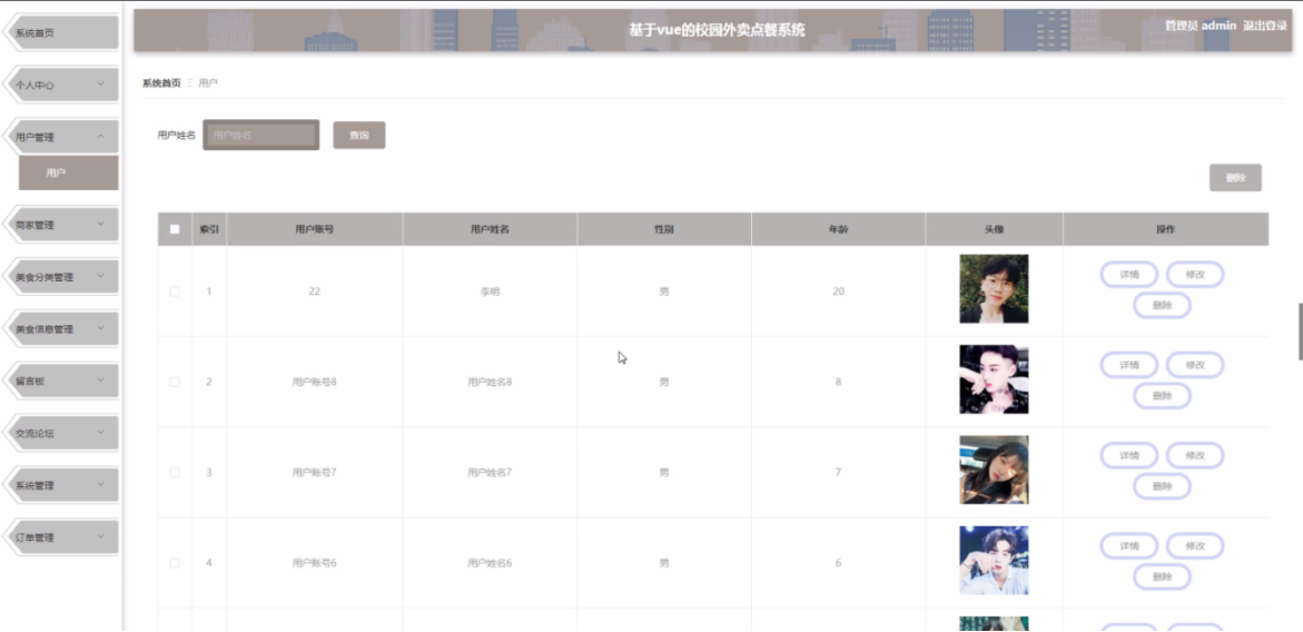 管理员点击用户管理,在用户管理页面的输入用户账号、用户姓名、性别、年龄、头像等信息,进行查询或者删除用户信息等操作,如图5-9所示。