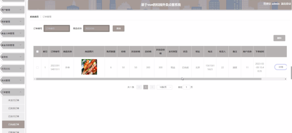 管理员点击订单管理,在订单管理页面的对订单编号、商品名称、商品图片、购买数量、价格、折扣价格、总价格、折扣总价格、支付类型、状态、地址、电话、收货人、备注、商户名称、下单时间等信息,进行查询或者删除订单信息等操作,如图5-14所示。