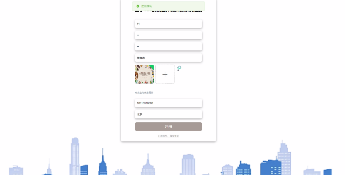 当商家进入系统进行相关操作前必须先注册登录,在注册页面填写商家账号、密码、确认密码、商家名称、商家图片、商家电话、商家地址等信息,然后点击注册,如图5-15所示。