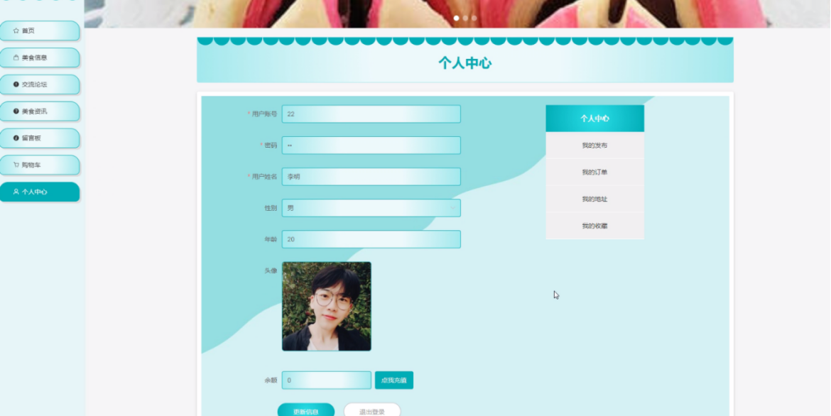 其他功能:系统首页展示、美食资讯发布、交流论坛、购物车功能、订单结算、地址管理等。