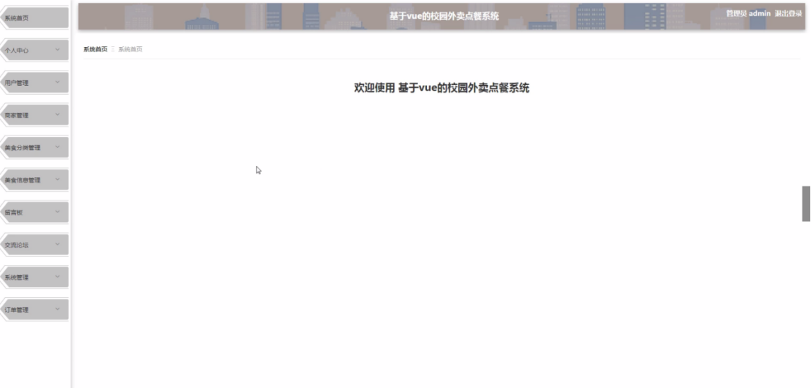 管理员进入系统主页面,主要功能包括对系统首页、个人中心、用户管理、商家管理、美食分类管理、美食信息管理、留言板、交流论坛、系统管理、订单管理等进行操作。如图5-8所示: