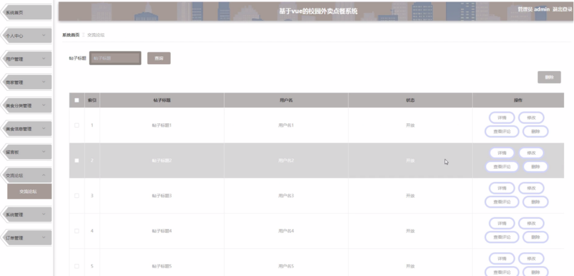 管理员点击交流论坛,在交流论坛页面的对贴子标题、用户名、状态等信息,进行查询或者删除交流论坛等操作,如图5-13所示。