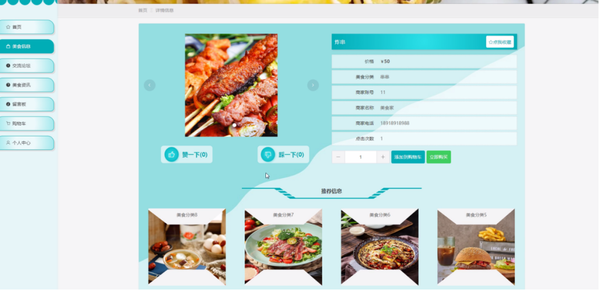 用户点击美食信息,在美食信息页面的搜索栏输入美食名称、美食分类、价格,进行查询,然后可以查看美食名称、美食分类、美食图片、商家账号、商家名称、商家电话、点击次数、价格等信息,如有需要进行添加到购物车、立即购买、收藏或者评论等操作,如图5-4所示。