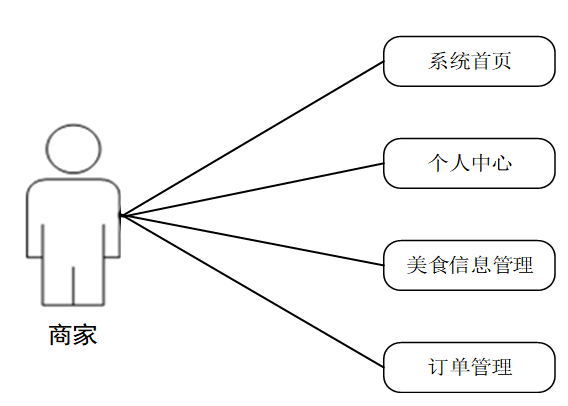 (2)、商家功能包含系统首页、个人中心、美食信息管理、订单管理等有关功能。商家用例如下: