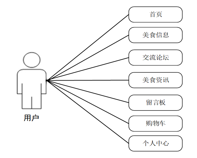 (1)、用户前台功能包含首页、美食信息、交流论坛、美食资讯、留言板、购物车、个人中心等有关功能。用户用例如下: