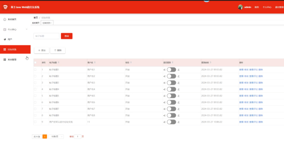 系统管理功能在视图层(view层)进行交互,比如点击“查询、添加或删除”按钮或填写系统管理的公告信息表单。这些系统管理表单动作被视图层捕获并作为请求发送给相应的控制器层(controller层)。控制器接收到这些请求后,调用服务层(service层)以执行相关的业务逻辑,例如验证输入数据的有效性和与数据库的交互。服务层处理完这些逻辑后,进一步与数据访问对象层(DAO层)交互,后者负责具体的数据操作如查看、修改或删除系统管理的公告信息,并将操作结果返回给控制器。最终,控制器根据这些结果更新视图层,以便系统管理功能可以看到最新的信息或相应的操作反馈。系统管理界面如图5-8所示;