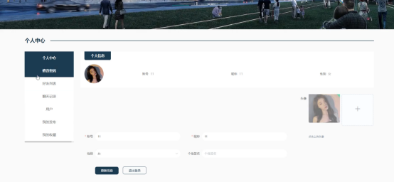 个人中心:在个人中心页面可以对个人中心、修改密码、好友列表、聊天记录、用户、我的发布、我的收藏进行详细操作;如图5-4所示: